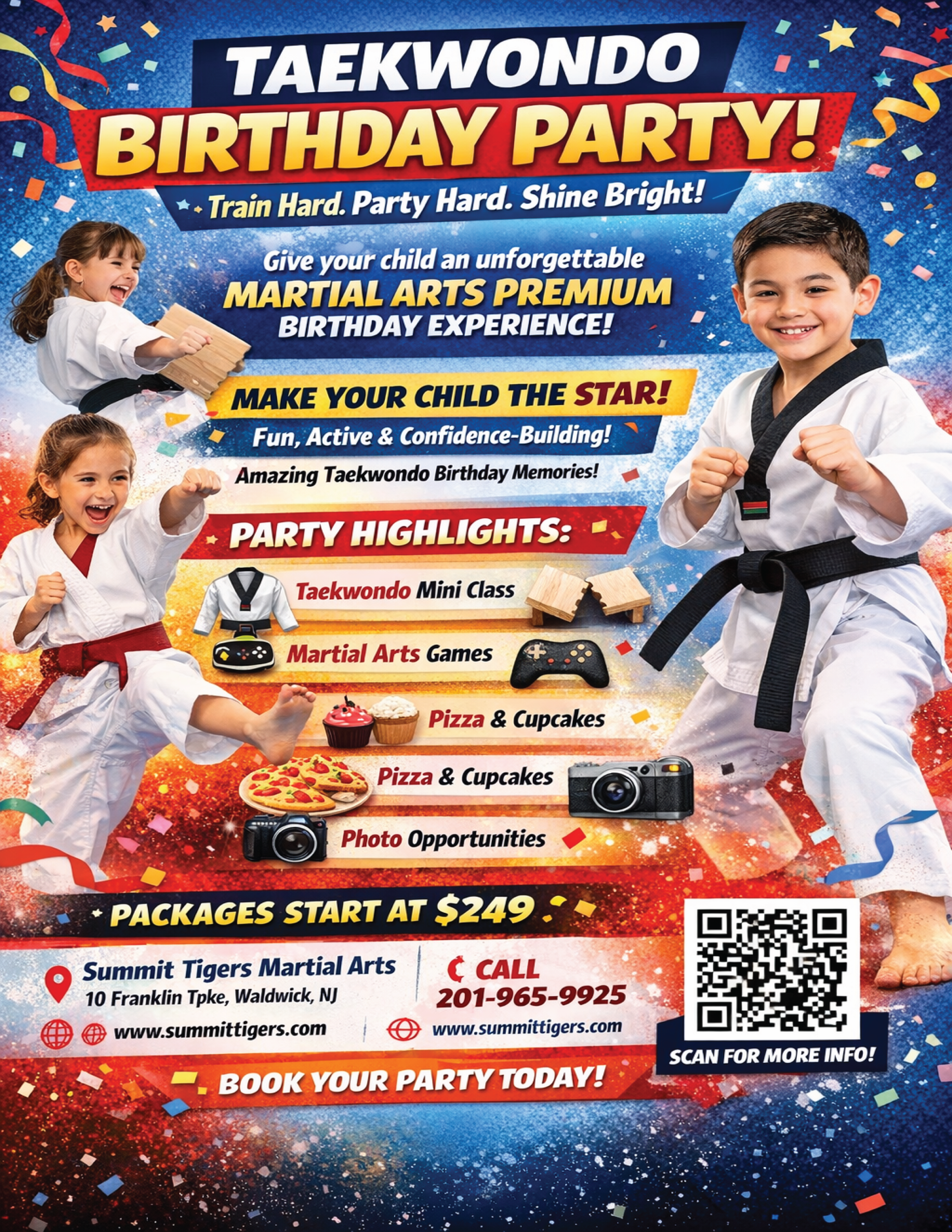 Let your child shine as the main character on their special day—building confidence, having fun with friends, and creating unforgettable memories through Taekwondo.
